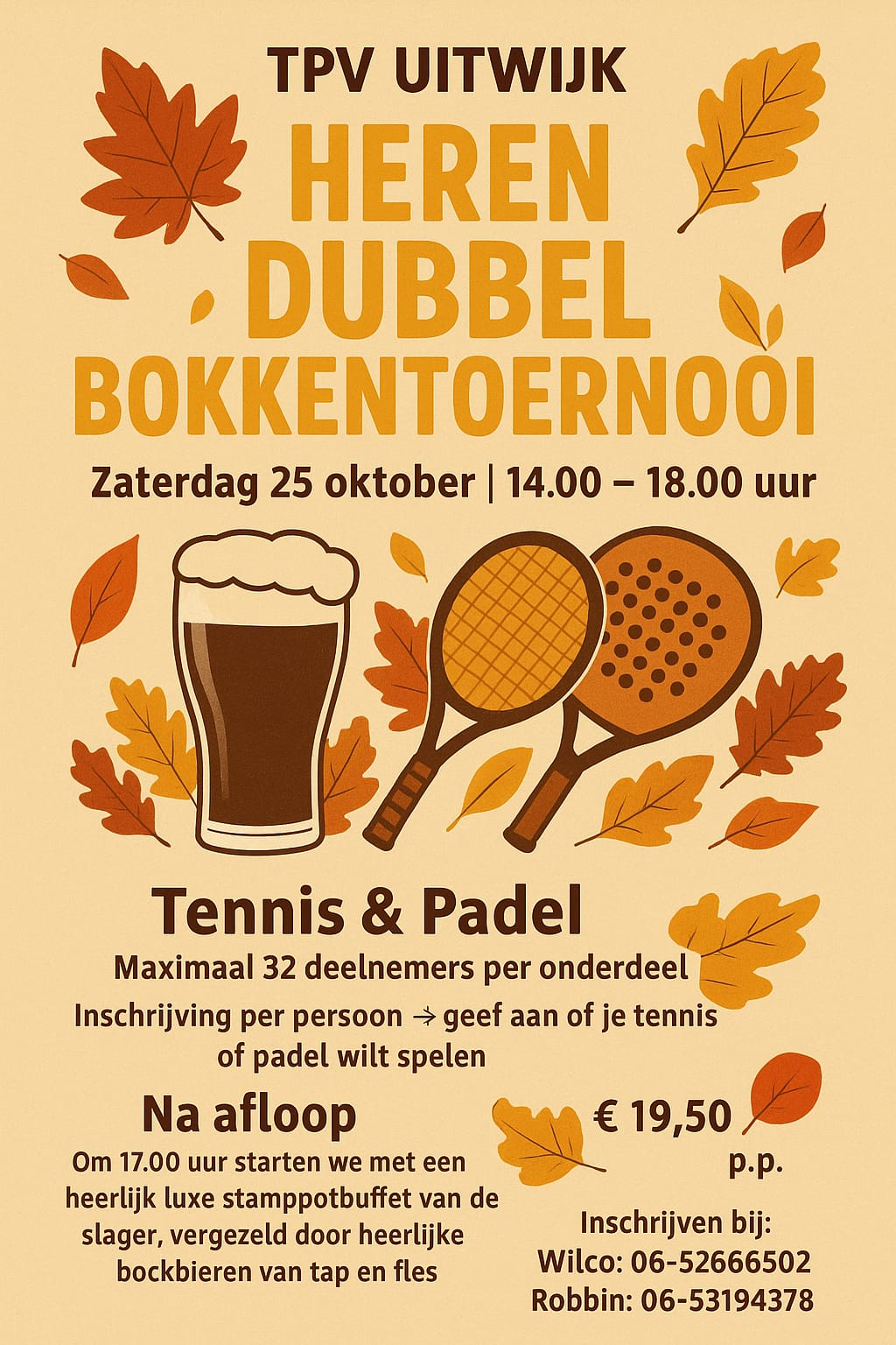 Op zaterdag 25 oktober van 14.00 tot 18.00 uur is weer het herendubbel bokkentoernooi! Doe jij ook mee? Je kunt je inschrijven voor tennis of padel. Let op: er is plek voor maximaal 32 deelnemers per onderdeel. Schrijf je dus snel in!