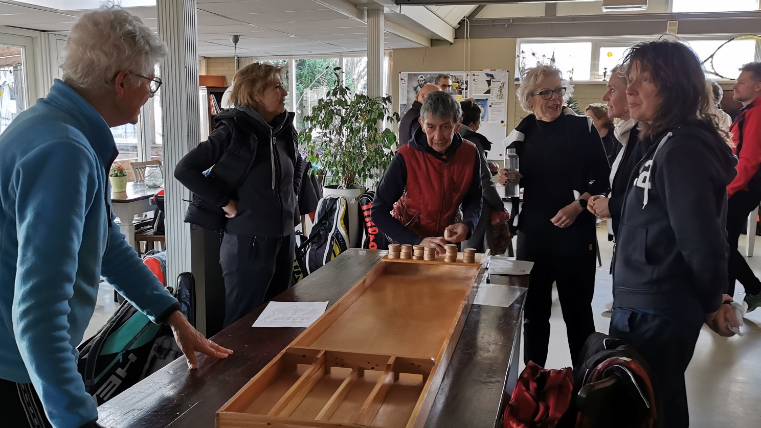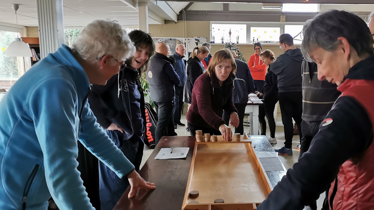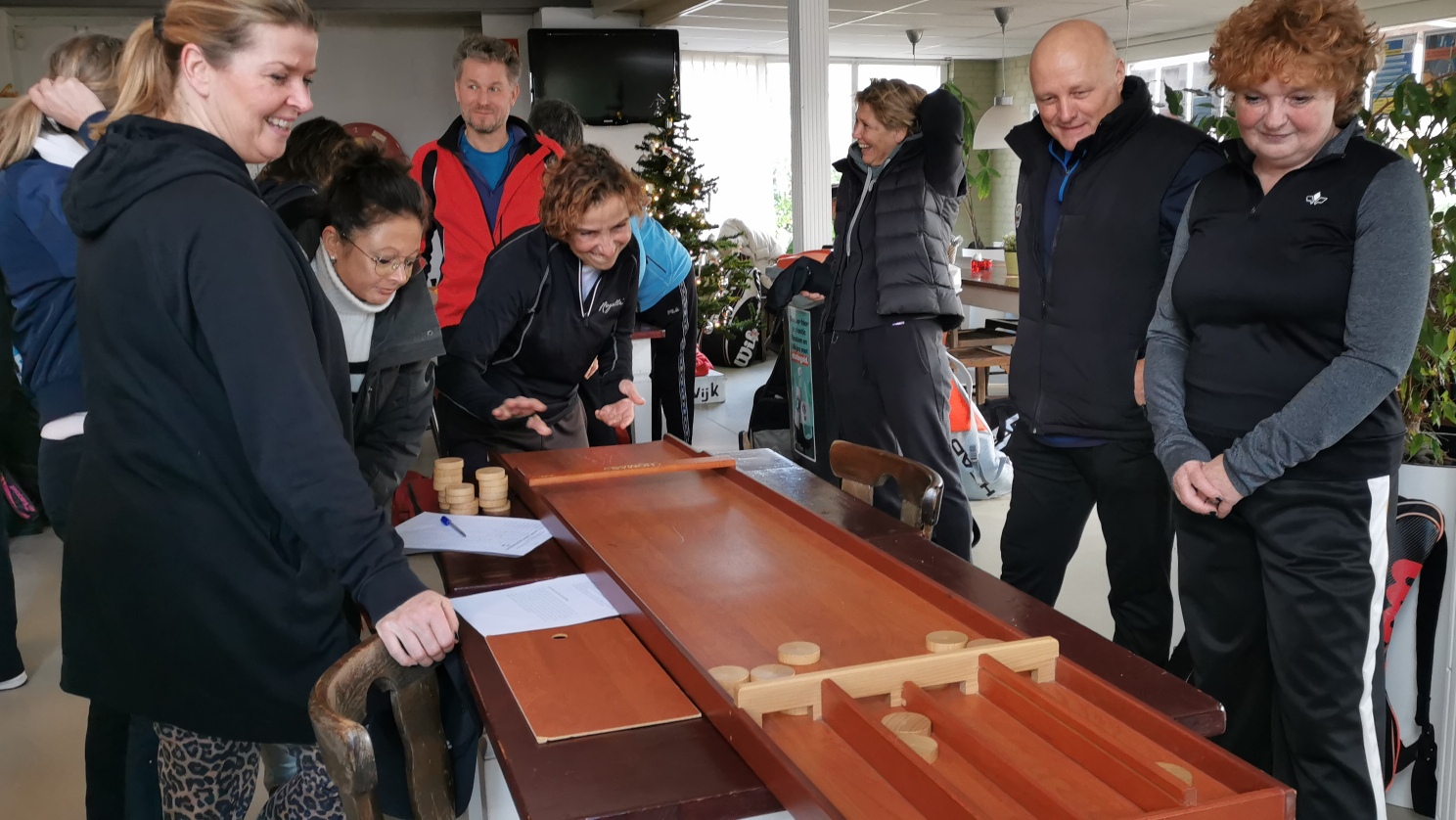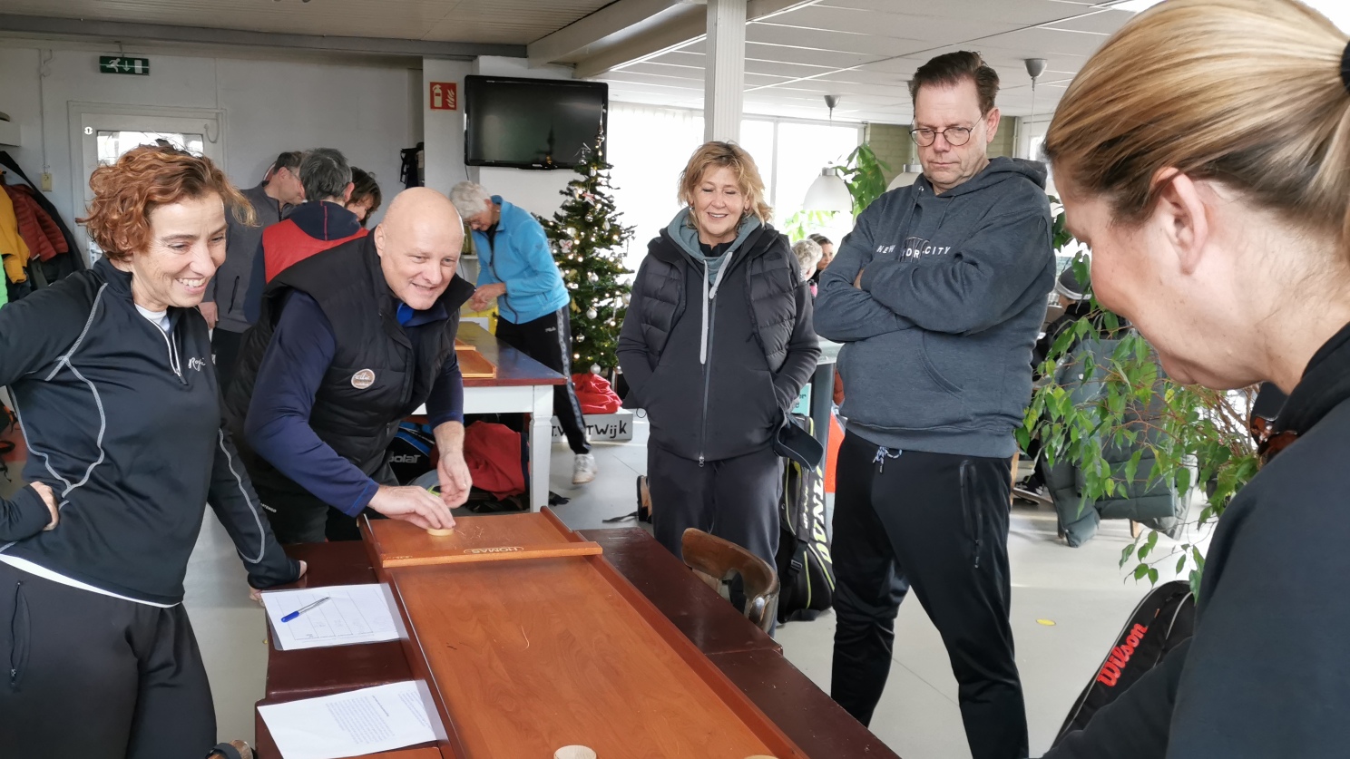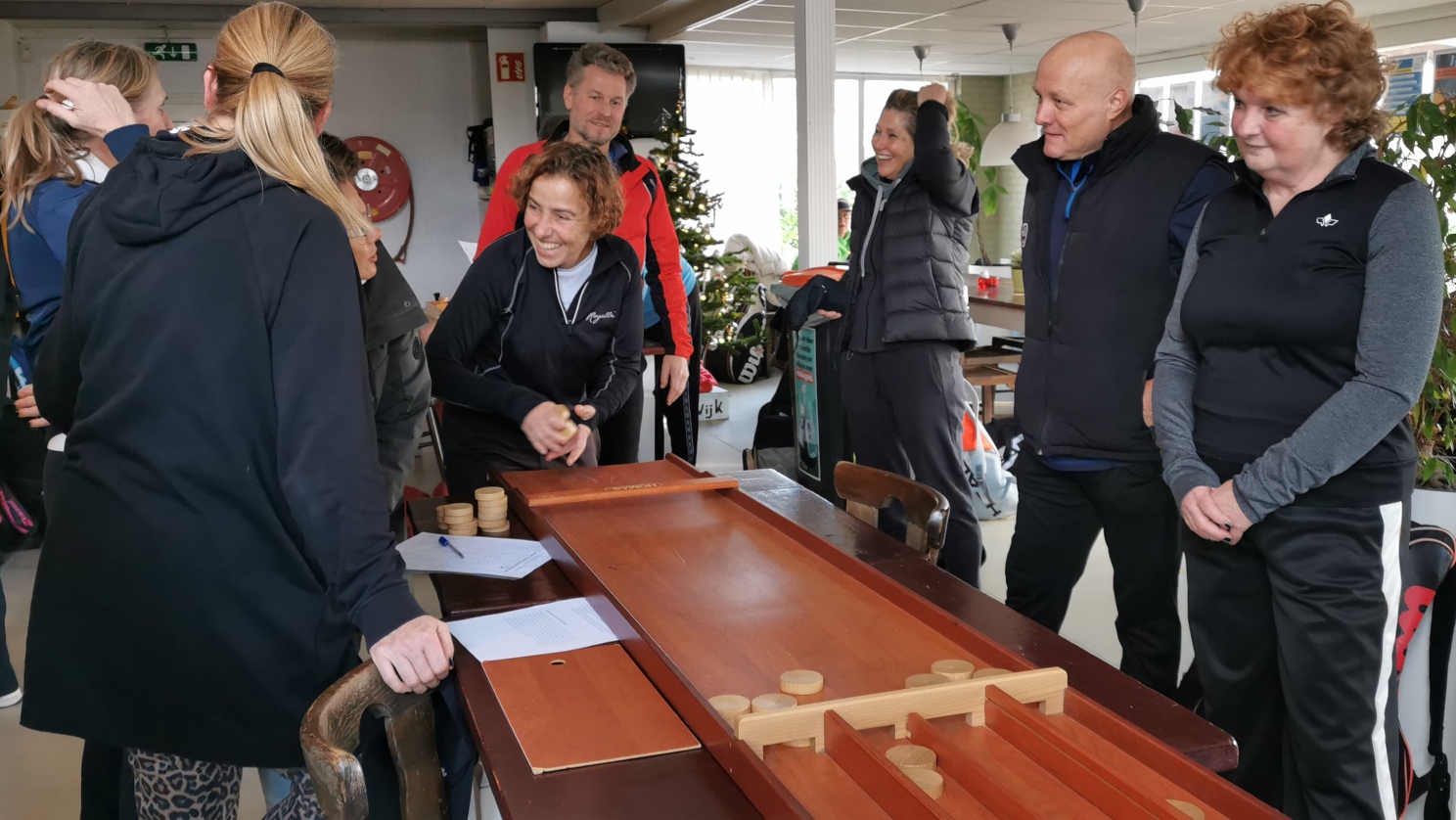 Had je even pauze, dan kon je je uitleven met de sjoelcompetitie binnen in het warme clubhuis. En ook daar ging het er fanatiek aan toe! En natuurlijk oliebollen eten, want Hennie Wesker was natuurlijk van de partij.