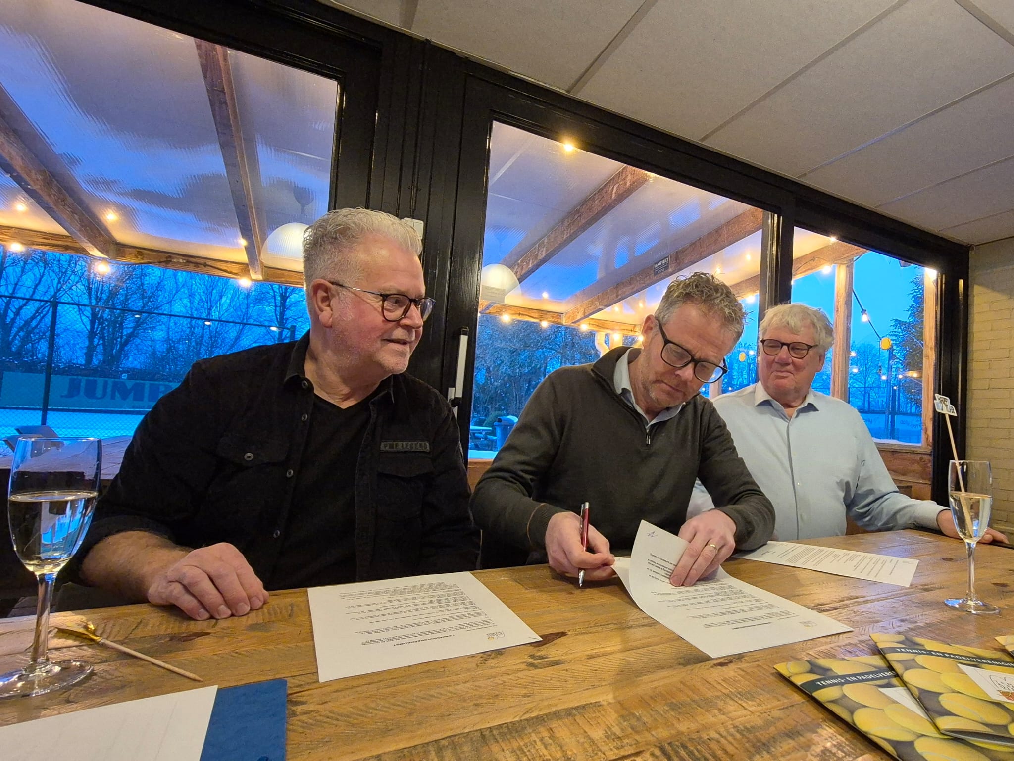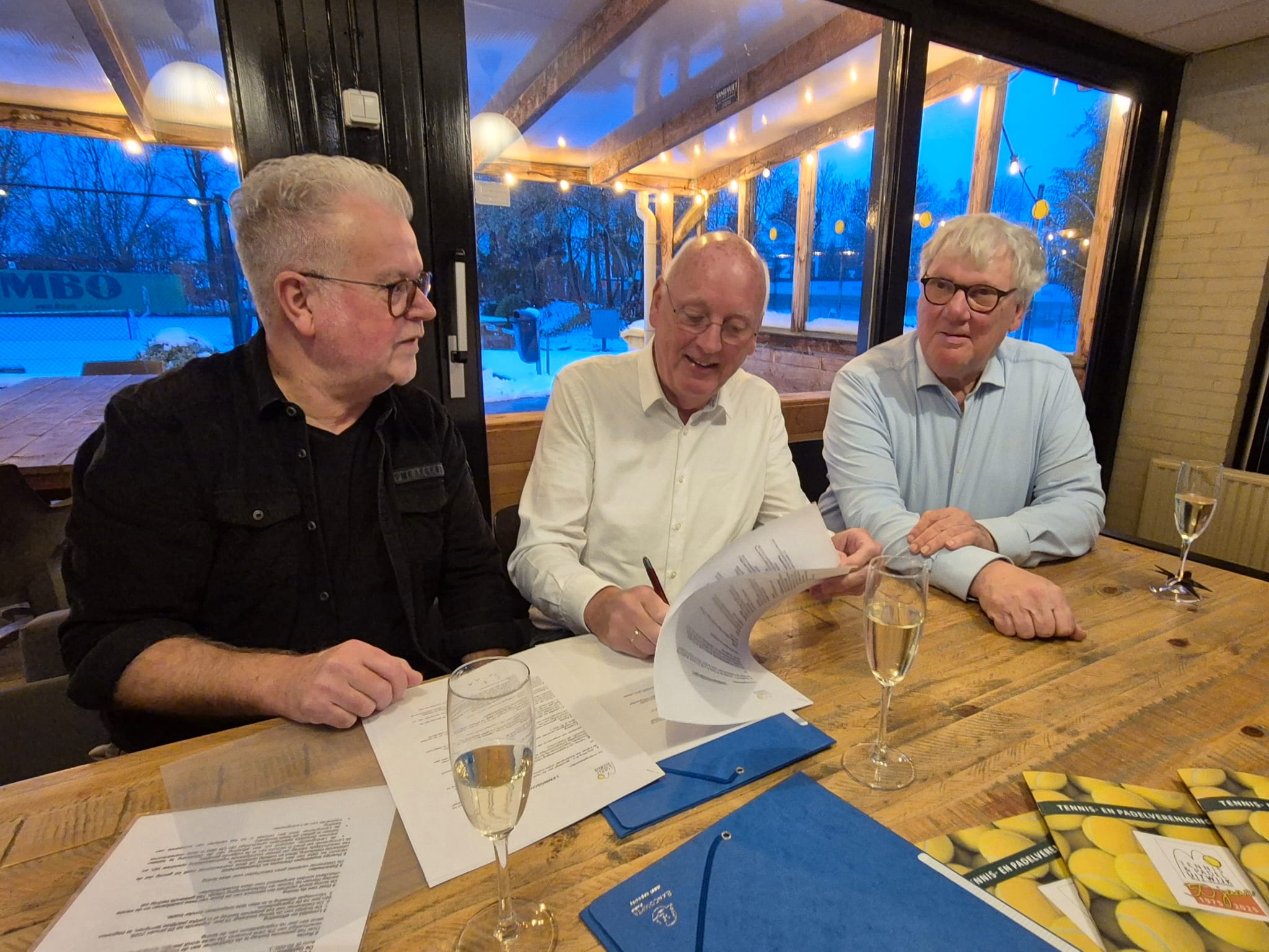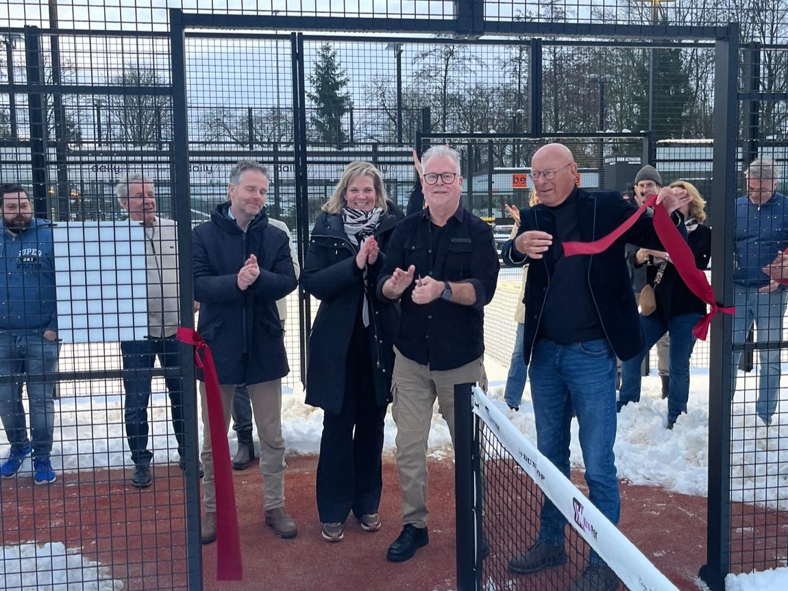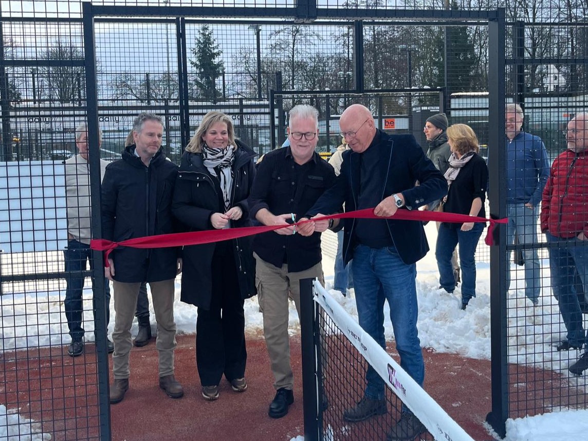 Daarna volgde het officiële moment: wethouder Bert Lubbinge knipte het lintje bij de nieuwe padelbanen door. Dit deed hij in het bijzijn van de drie partijen die investeren in onze nieuwe padelbanen. Een feestelijk en belangrijk moment voor onze vereniging. Aansluitend werd ook de investeringsovereenkomst ondertekend door de investeerders samen met Loet en Jan.